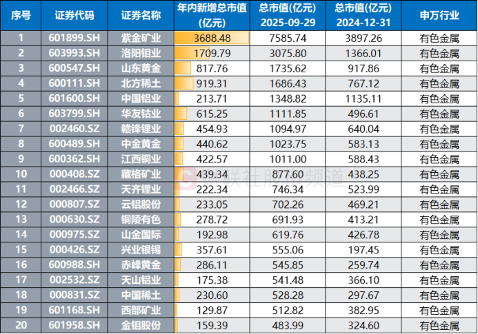 注:紫金矿业年内融资余额变动情况(截至9月26日数据)受股价持续新高提振,紫金矿业目前总市值(证监会算法)已升至7586亿元,在整个A股中的市值排名超越中国神华位居第15位,同时在有色金属板块中稳居第一,且市值规模是第2位洛阳钼业(3075.80亿元)的2.5倍。目前,有色金属板块内共有千亿市值股9只,整体占比近6.4%,其中,共有6股为年内新增的千亿市值股。