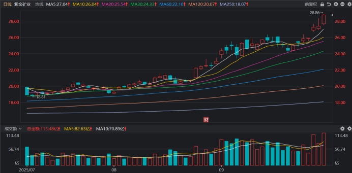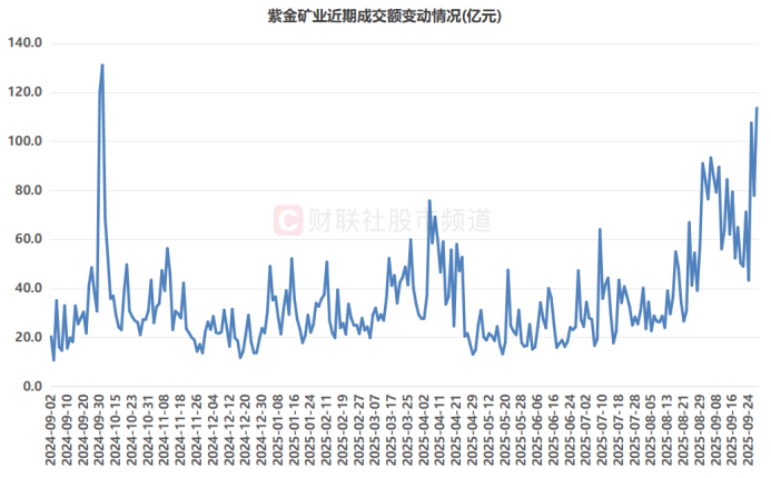 近期,紫金矿业股价表现活跃,截至9月29日收盘,其已实现7日连涨,连涨天数目前仅次于9月中旬起便持续上涨的华海清科(10连涨)。从量能数据上看,紫金矿业9月29日放量明显,全天成交额达119.90亿元,创去年10月8日以来新高,同时在整个历史行情中位居第三位,仅次于2024年10月8日(130.99亿元)以及同年9月30日(119.90亿元)。