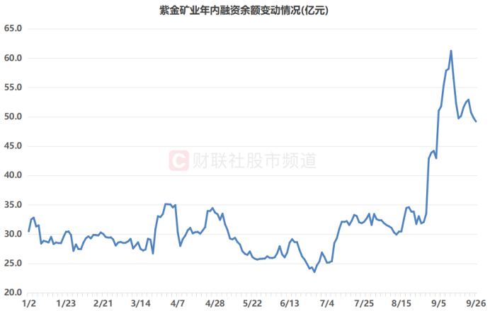 注:紫金矿业近期成交额变动情况(截至9月29日收盘)不过,相较于股价持续上涨,紫金矿业近期的融资余额则连日下滑。截至9月26日数据,其目前融资余额已降至49.19亿元,较此前于9月12日录得的年内最高点同时也是历史最高点累计减少近12.03亿元,降幅近19.65%。其中,在9月15日、16日期间,紫金矿业连续2日遭融资客减持超4亿元,9月17日、24日的融资净卖额也双双在2亿元以上。