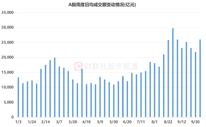 财联社10月11日讯(编辑梓隆),节后首周(10月9日至10日),A股市场交投数据较节前明显抬升,沪深京三市周内平均每日成交额达2.60万亿元,创9月5日(9月1日至5日当周)以来周度日均成交额新高。从年内行情上看,其日均成交额规模位居次高纪录,仅低于8月25日至29日当周数据。