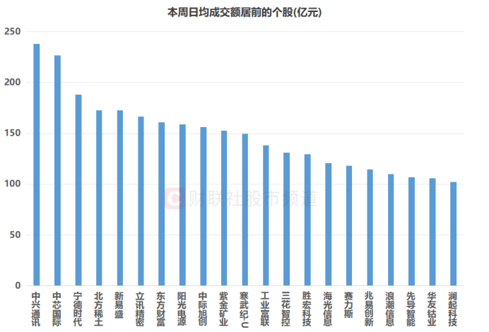 具体个股来看,累计共有21股本周日均成交额在100亿元以上。其中,中兴通讯、中芯国际唯二超200亿元,宁德时代、北方稀土、新易盛、立讯精密、东方财富等股日均成交额也居前。分行业板块来看,这些热股主要集中在电子、电力设备、通信、有色金属四大板块,其中,电子股独占近4成比例。此外,还涵盖非银金融、计算机、家用电器、汽车股。