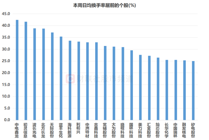 注:本周日均成交额居前的个股(截至10月10日数据)若以换手率数据统计,不计算近1个月上市的新股,累计共有13股本周日均换手率在30%以上。其中,计算机股中电鑫龙、初灵信息日均换手率分别达42.44%、41.68%,波长光电、北方长龙、天际股份、蓝丰生化、海科新源等股也在本周交投活跃。同样以行业板块统计,这13只个股中,电力设备、电子、机械设备、计算机、有色金属股数量相对较多。