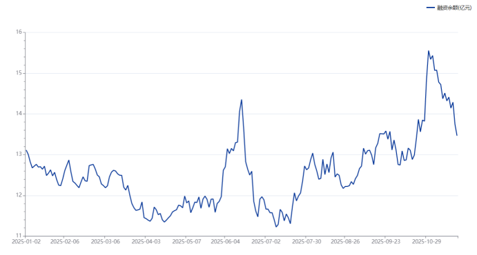注1:中国银行、贵州茅台近期总市值变动情况(截至11月20日收盘)注2:总市值以证监会算法统计(A股股本*A股股价+其他市场股本*其他市场股价*汇率)从资金面来看,相较于持续攀升的股价走势,中国银行近期的融资余额数据则持续下降。截至11月19日数据,其目前融资余额已降至13.47亿元,较10月30日时高点(15.56亿元)共减少近2.09亿元,降幅达13.4%。不过,从全年行情上看,中国银行目前的融资余额仍处于年内均值(12.55亿元)上方水平。