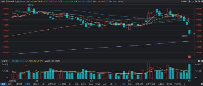 财联社讯(编辑梓隆),4月1日,光伏龙头股阳光电源延续调整态势,截至收盘,其全天跌幅近10.82%,且这已是连续第五个交易日收跌,期间累计回撤19.53%。盘中,阳光电源股价一度跌至131元,创2025年9月以来近6个月新低。