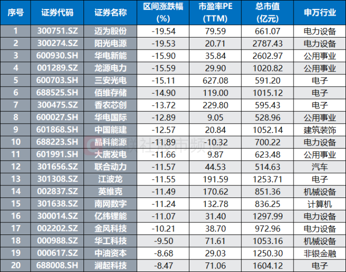 注:近5日跌幅居前的500亿元以上市值股(截至4月1日收盘)分行业板块(申万一级)来看,上述17只个股主要集中在电力设备、电子、公用事业板块,其三大板块合计占比76%,同时还涵盖机械设备、计算机、建筑装饰、汽车板块。若统计其细分板块(申万二级),电力、光伏设备、半导体股数量相对较多,此外还包含IT服务、电池、风电设备、光学光电子、基础建设、其他电子、汽车零部件、专用设备股。