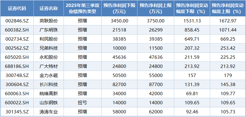 以预计净利润变动幅度上限来看,2家公司预计净利润变动幅度上限超10倍,3家公司预计超5倍,11家公司预计实现翻倍。其中,英联股份(002846.SZ)预计今年前三季度实现净利润3450万元至3750万元,同比增长1531.13%至1672.97%。