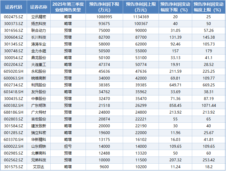 以预计净利润上限来看,1家预计净利润上限超过100亿元,2家超过10亿元,23家超过1亿元,占比超过74%。其中,立讯精密(002475.SZ)预计今年前三季度实现净利润108.90亿元至113.44亿元,同比增长20%至25%。立讯精密表示,公司持续加大在AI智能终端、光电高速互联产品以及汽车智能电子电器等前沿领域的研发投入与市场渗透,不断提升核心竞争力。