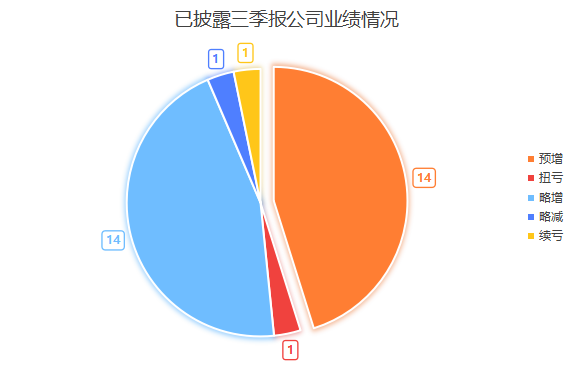在三季报业绩预喜的上市公司中,基础化工行业有5家,电子行业5家,汽车行业4家,电力设备行业4家,机械设备行业3家。