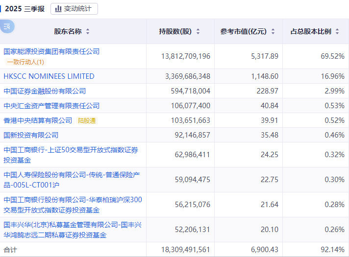 截至2025年三季度末,国家能源投资集团持有公司69.52%的股权,实际控制人国务院国资委通过控股国家能源集团间接持有公司62.57%股权。
