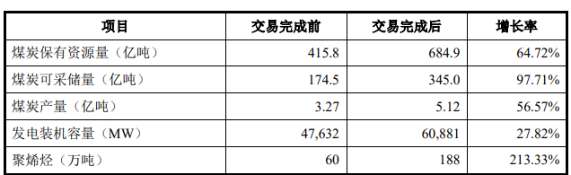 据披露,收购完成后,公司煤炭保有资源量将由415.8亿吨提升至684.9亿吨,增幅达64.7%;煤炭可采储量将由174.5亿吨提升至345.0亿吨,增幅达97.7%;煤炭产量将由3.27亿吨提升至5.12亿吨,增幅达56.6%;发电装机容量将由47632MW提升至60881MW,增幅27.8%;聚烯烃产能将由60万吨提升至188万吨,增幅达213.3%。