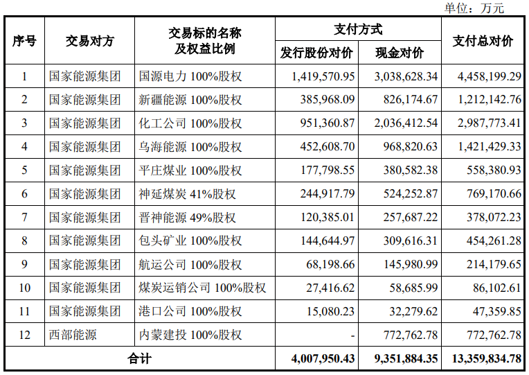 中国神华拟通过发行A股股份及支付现金的方式购买国家能源集团持有的国源电力100%股权、新疆能源100%股权、化工公司100%股权、乌海能源100%股权、平庄煤业100%股权、神延煤炭41%股权、晋神能源49%股权、包头矿业100%股权、航运公司100%股权、煤炭运销公司100%股权、港口公司100%股权,并以支付现金的方式购买西部能源持有的内蒙建投100%股权。