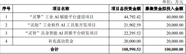 本次发行预计募集资金总额为不超过人民币100,000.00万元(含),扣除发行费用后拟用于“灵擎”工业AI赋能平台建设项目、“灵助”工业软件AI工具集开发项目、“灵智”具身智能AI训推平台研发项目、补充流动资金。