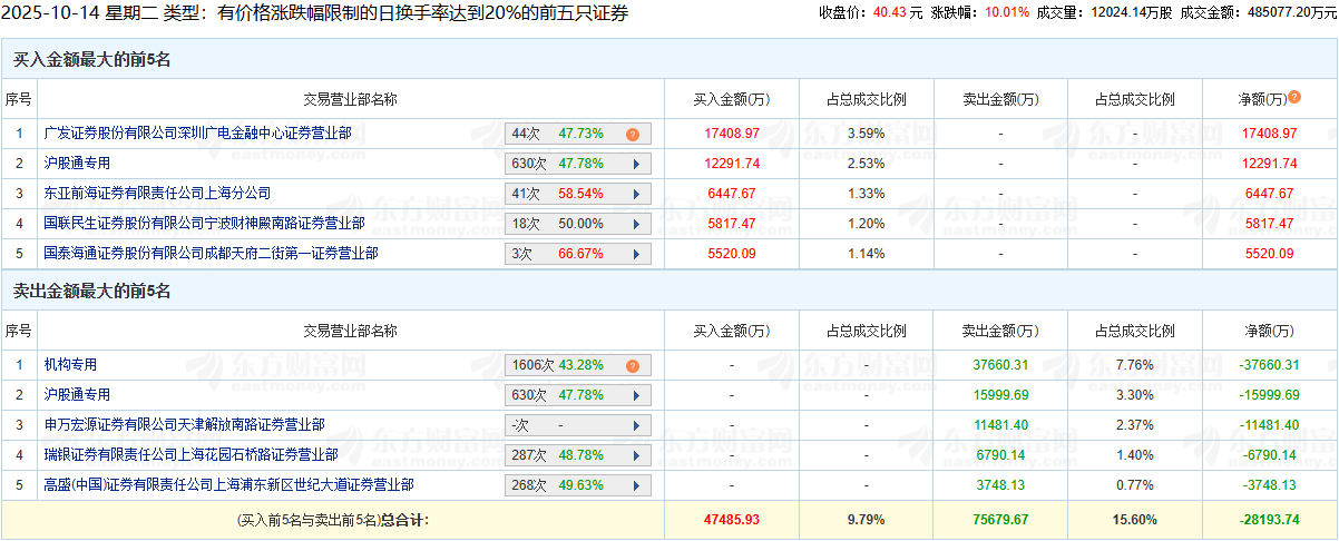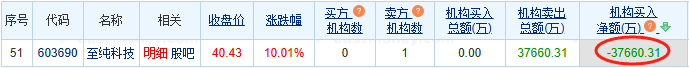 龙虎榜数据显示,卖出至纯科技金额最大的前5名中,1家为机构专用席位。经统计,机构席位今日卖出至纯科技净额为37660.31万元。