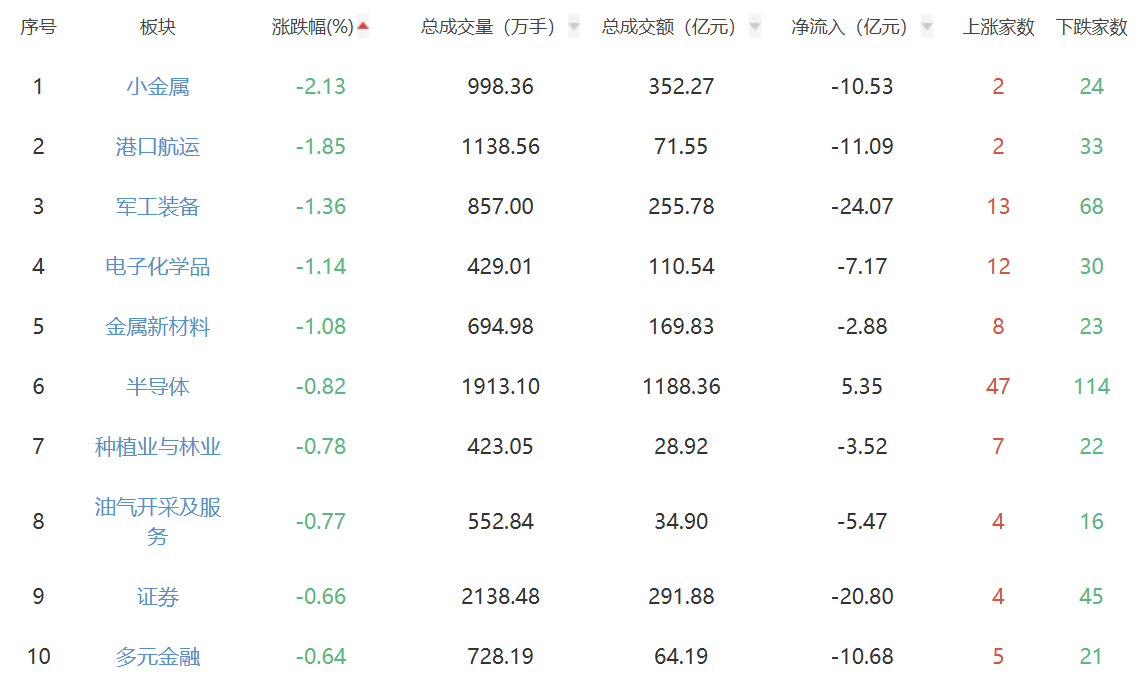 板块方面,化学制药、美容护理、医疗服务等板块涨幅居前,小金属、港口航运、军工装备等板块跌幅居前。