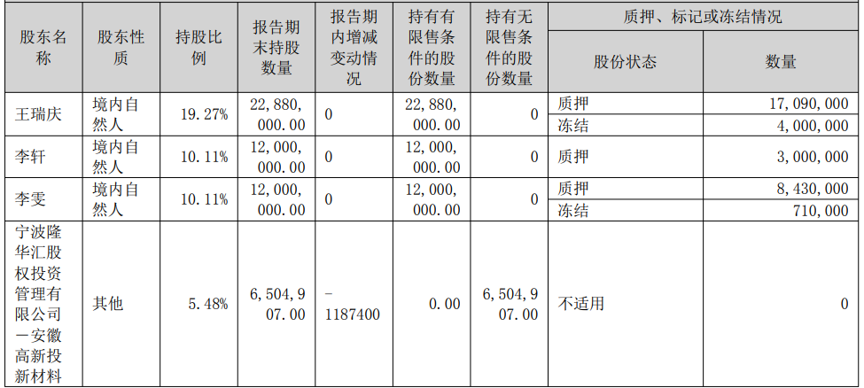 公司于2025年10月14日收到股东安徽高新投新材料产业基金合伙企业(有限合伙)(以下简称“新材料基金”)发来的《股份减持告知函》,新材料基金计划自公告披露之日起15个交易日后的未来3个月内以集中竞价方式、大宗交易方式减持公司股份不超过3,562,200股(占公司总股本的3%)。其中通过集中竞价方式减持股份不超过1,187,400股,减持比例不超过公司总股本的1%;通过大宗交易方式减持股份不超过2,374,800股,减持比例不超过公司总股本的2%。