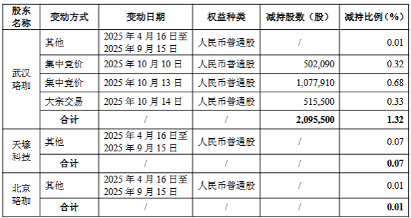 此外,2025年4月16日至2025年9月15日期间,受公司限制性股票激励计划股份归属导致的总股本增加影响,武汉珞珈、上海天壕科技有限公司(以下简称“天壕科技”)和北京珞珈天壕投资中心(有限合伙)(以下简称“北京珞珈”)持股比例被动稀释,合计降低0.09%。