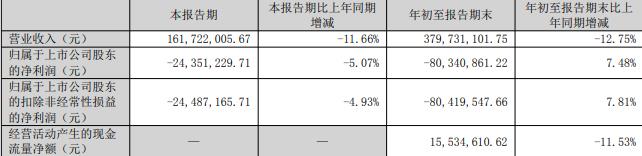 年初至报告期末,公司实现营业收入3.80亿元,同比减少12.75%;归属于上市公司股东的净利润-8034.09万元;扣除非经常性损益后的净利润-8041.95万元;经营活动产生的现金流量净额1553.46万元,同比减少11.53%。