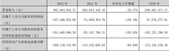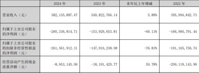 据公司2024年年报,报告期内,公司实现营业收入5.82亿元,同比增长5.88%;归属于上市公司股东的净利润-2.60亿元,2023年为-1.54亿元,2022年为-1.67亿元,2021年为-7306.83万元;扣除非经常性损益后的净利润-2.62亿元,2023年为-1.48亿元,2022年为-1.91亿元,2021年为-9310.78万元,2020年为-1.02亿元,经营活动产生的现金流量净额-895.31万元。