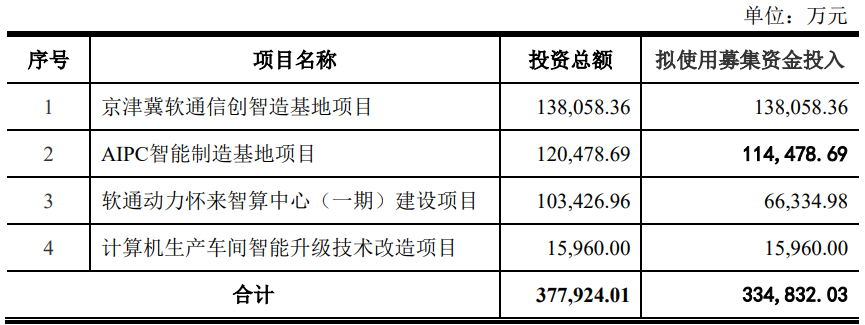软通动力11月11日披露的2025年度向特定对象发行股票募集说明书(修订稿)显示,公司本次向特定对象发行募集资金总额不超过人民币334,832.03万元(含本数),扣除发行费用后的募集资金净额将用于京津冀软通信创智造基地项目、AIPC智能制造基地项目、软通动力怀来智算中心(一期)建设项目、计算机生产车间智能升级技术改造项目。