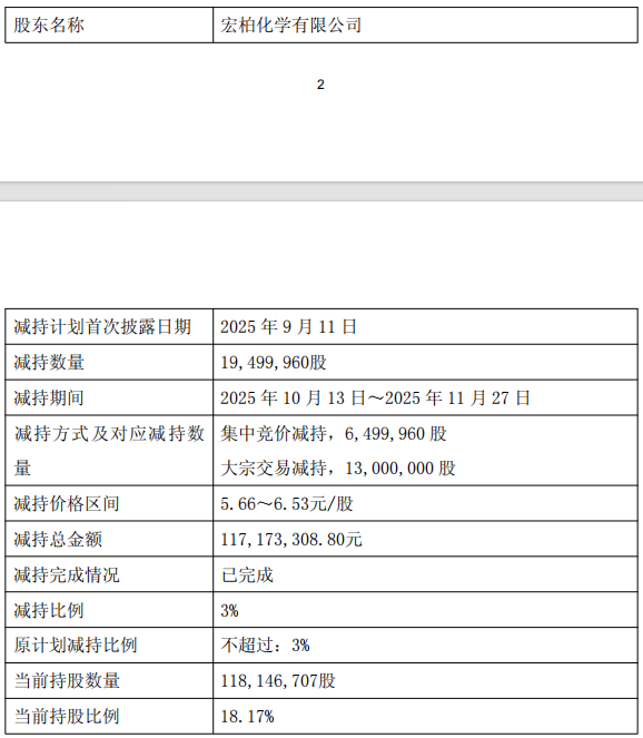近日,公司收到宏柏化学出具的《关于减持计划完成暨减持结果的告知函》。2025年10月13日至2025年11月27日,宏柏化学通过大宗交易、集中竞价方式累计减持19,499,960股,占公司当前股份总数的3.00%。其中,通过大宗交易方式减持13,000,000股,占公司当前总股本2.00%;通过集中竞价交易方式减持6,499,960股,占公司当前总股本1.00%。减持价格区间为5.66至6.53元/股,减持总金额为117,173,308.80元。