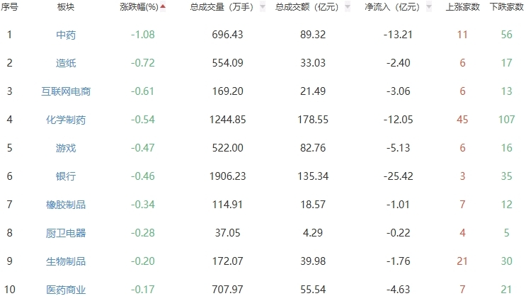 板块方面,能源金属、贸易、饮料制造等板块涨幅居前,中药、造纸、互联网电商等板块跌幅居前。