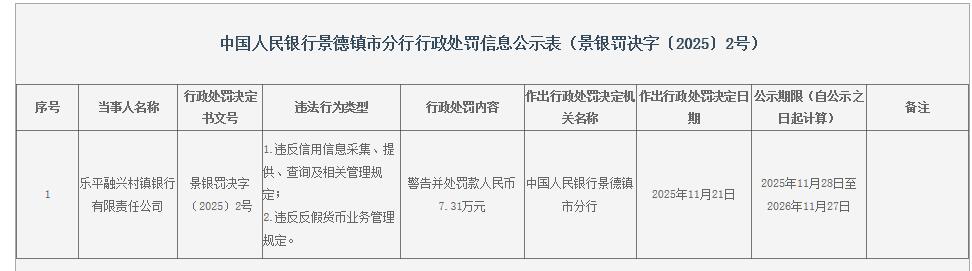 中国经济网北京11月30日讯 中国人民银行景德镇市分行近日公布的行政处罚信息公示表(景银罚决字〔2025〕2号)显示,乐平融兴村镇银行有限责任公司违反信用信息采集、提供、查询及相关管理规定;违反反假货币业务管理规定。中国人民银行景德镇市分行对其警告并处罚款人民币7.31万元。