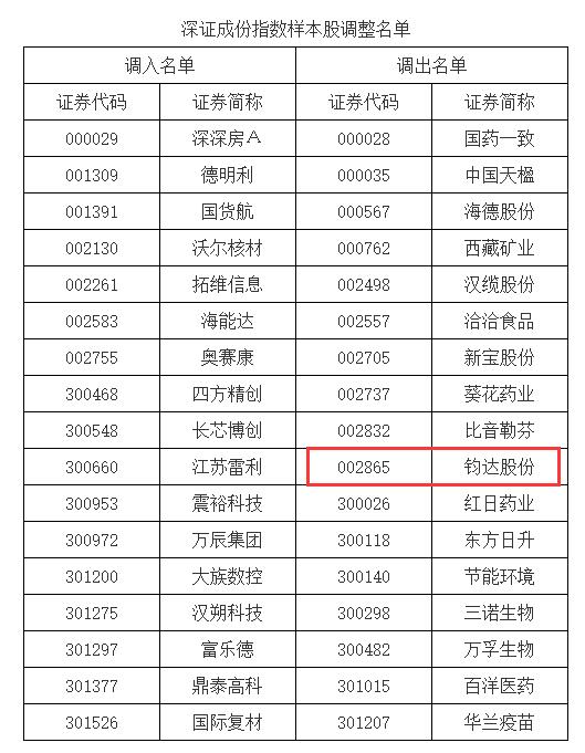 钧达股份(002865)被调出深证成份指数样本股名单。