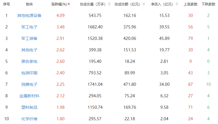 板块方面,其他电源设备、军工电子、军工装备等板块涨幅居前,贵金属、保险、白酒等板块跌幅居前。