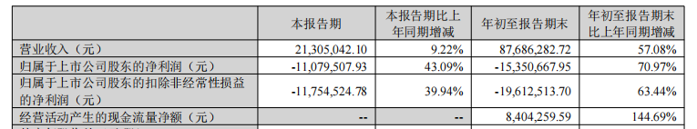中国经济网北京12月30日讯 天迈科技(300807.SZ)2025年三季度报告显示,2025年前三季,公司实现营业收入8768.63万元,同比增长57.08%;归属于上市公司股东的净利润-1535.07万元,同比增长70.97%;归属于上市公司股东的扣除非经常性损益的净利润-1961.25万元,同比增长63.44%;经营活动产生的现金流量净额为840.43万元,同比增长144.69%。
