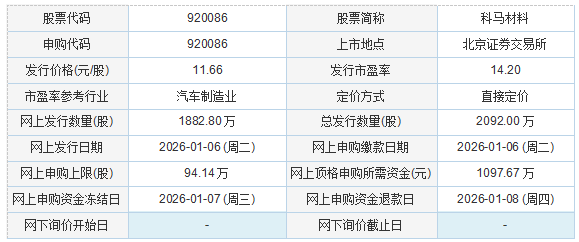 科马材料2025年12月31日披露的向不特定合格投资者公开发行股票并在北京证券交易所上市发行公告显示,若本次发行成功,预计公司募集资金总额为24,392.72万元,扣除预计发行费用3,775.92万元(不含增值税)后,预计募集资金净额为20,616.80万元(如存在尾数差异,为四舍五入造成)。