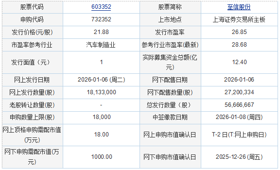 至信股份2026年1月5日披露的首次公开发行股票并在主板上市发行公告显示,按本次发行价格21.88元/股和56,666,667股的新股发行数量计算,若本次发行成功,预计公司募集资金总额123,986.67万元,扣除约11,331.46万元(不含增值税)的发行费用后,预计募集资金净额112,655.21万元(如有尾数差异,为四舍五入所致)。