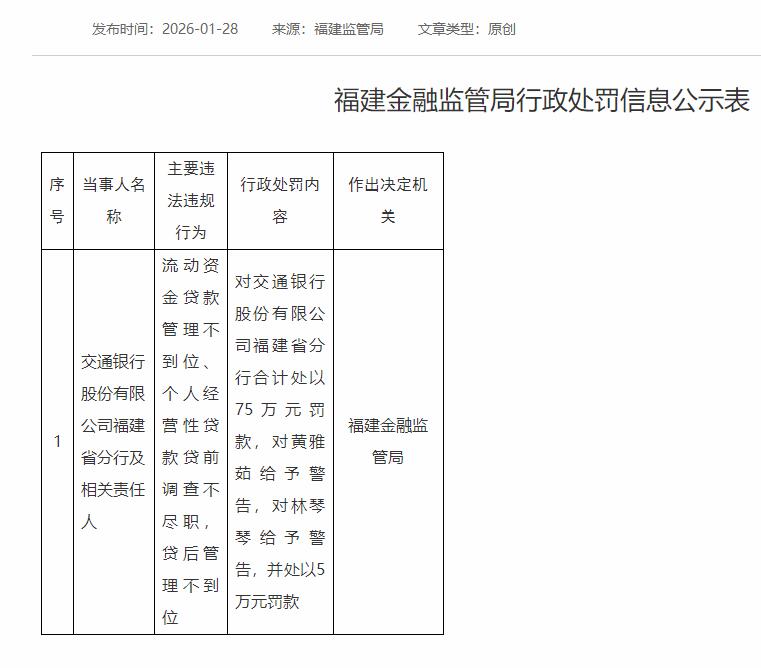 福建金融监管局对交通银行股份有限公司福建省分行合计处以75万元罚款,对黄雅茹给予警告,对林琴琴给予警告,并处以5万元罚款。