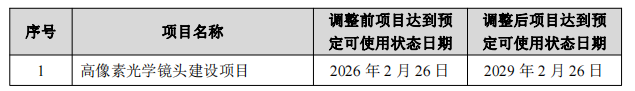 公司于2026年2月12日召开第六届董事会第十六次(临时)会议,审议通过了《关于部分募集资金投资项目重新论证并延期的议案》,在保持募集资金投资项目投资用途及投资规模不发生变更的前提下,同意根据目前募集资金投资项目的实施进度,结合市场环境的变化以及公司实际情况,对“高像素光学镜头建设项目”进行重新论证,并将该项目达到预定可使用状态日期延期至2029年2月26日。