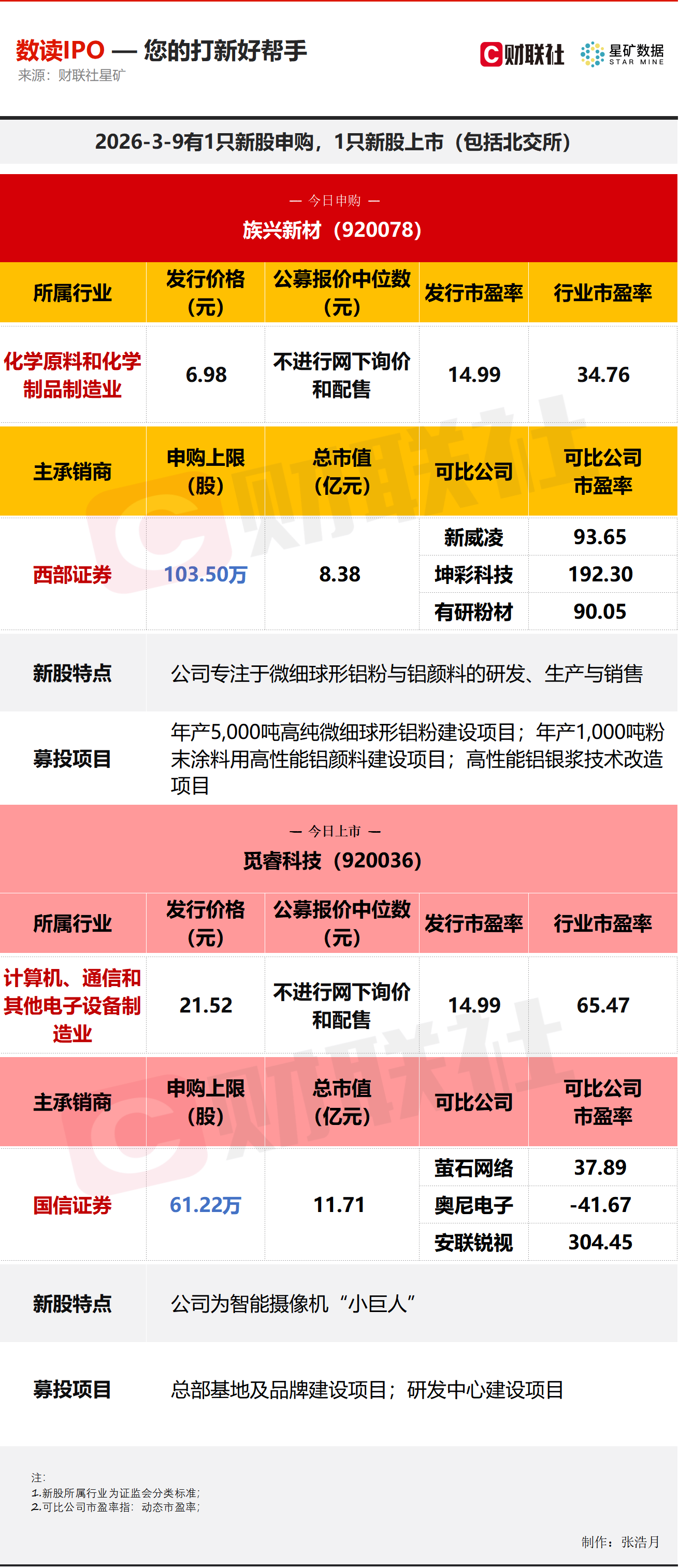 财联社3月9日讯,今日有1只新股申购,为北交所的族兴新材;1只新股上市,为北交所的觅睿科技。