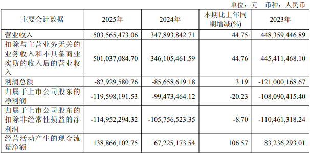 2022年至2024年,公司营业收入分别为8.00亿元、4.48亿元、3.48亿元;归属于上市公司股东的净利润分别为-5,539.19万元、-1.08亿元、-9,947.35万元;归属于上市公司股东的扣除非经常性损益的净利润分别为-6,597.40万元、-1.10亿元、-1.06亿元;经营活动产生的现金流量净额为-2.98亿元、8,323.63万元、6,722.52万元。