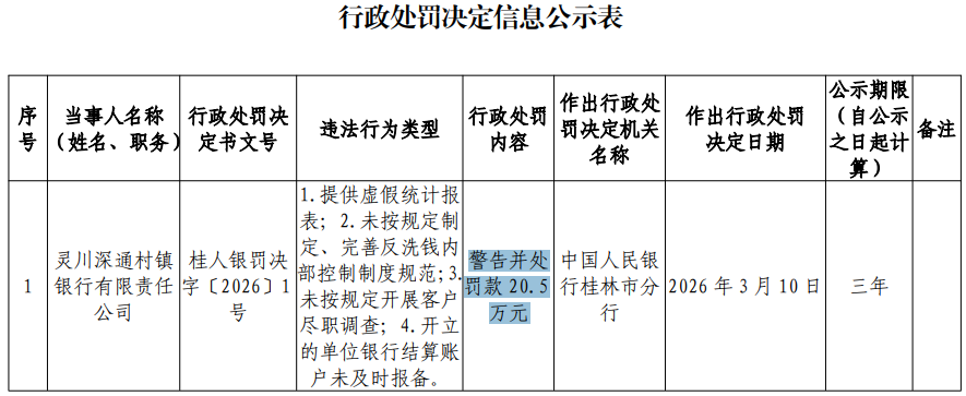 中国人民银行桂林市分行对灵川深通村镇银行有限责任公司警告并处罚款20.5万元。