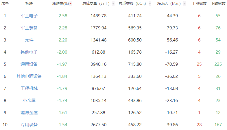 板块方面,煤炭开采加工、风电设备、化学纤维等板块涨幅居前,军工电子、军工装备、元件等板块跌幅居前。