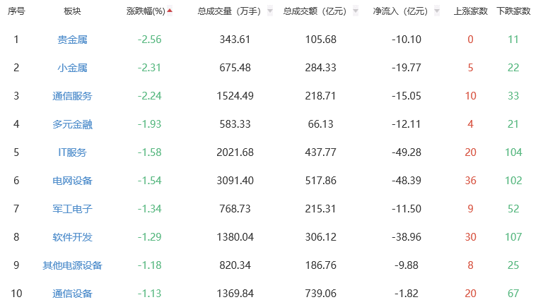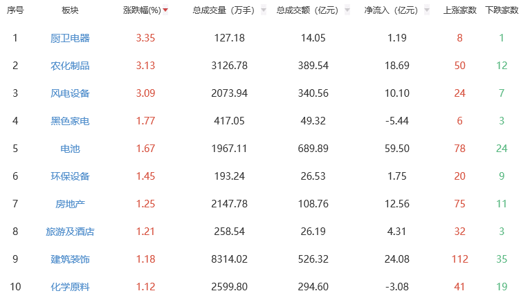 板块方面,厨卫电器、农化制品、风电设备等板块涨幅居前,贵金属、小金属、通信服务等板块跌幅居前。
