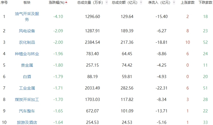 板块方面,通信服务、元件、电子等板块涨幅居前,油气开采及服务、风电设备、农化制品等板块跌幅居前。