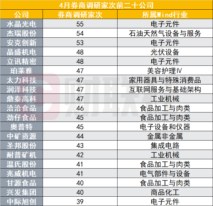 具体来看,水晶光电是4月券商关注度最高的上市公司,共获得券商调研55家次;杰瑞股份、安克创新接受调研数量均超过50家次;晶盛机电、立讯精密、珀莱雅、太力科技、润泽科技、鼎泰高科、洽洽食品等公司也获得较高关注度。