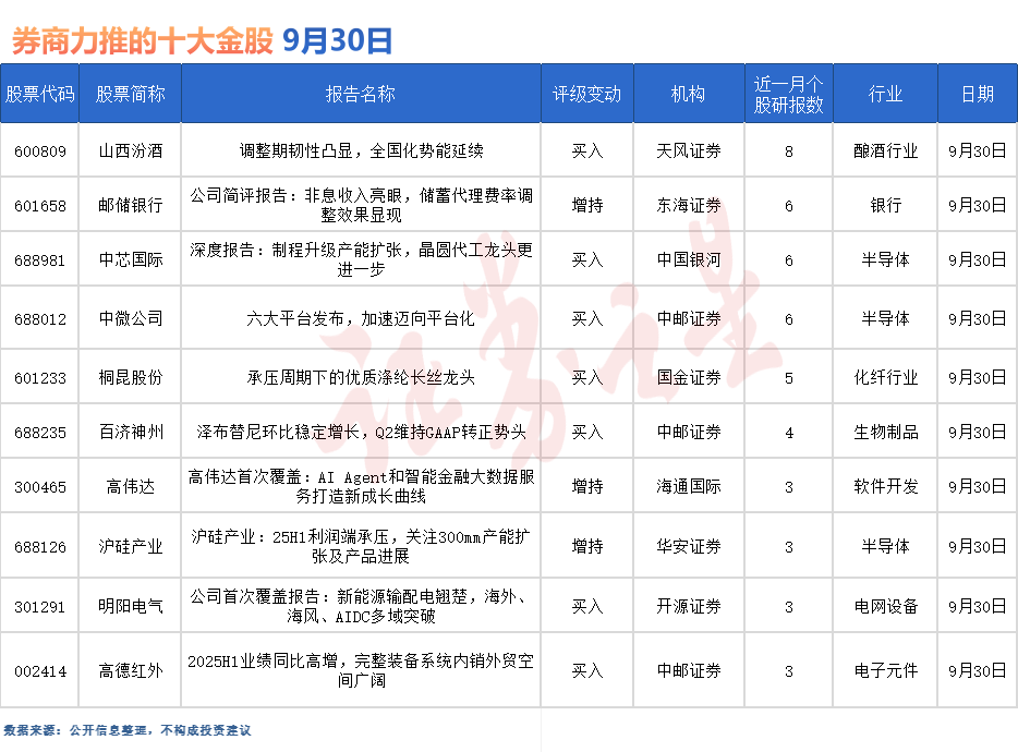 山西汾酒最受券商关注,近一个月获中原证券、中国银河、开源证券、华安证券、中邮证券、民生证券、国元证券、华鑫证券等8份券商研报关注,位居9月30日券商力推股榜首。