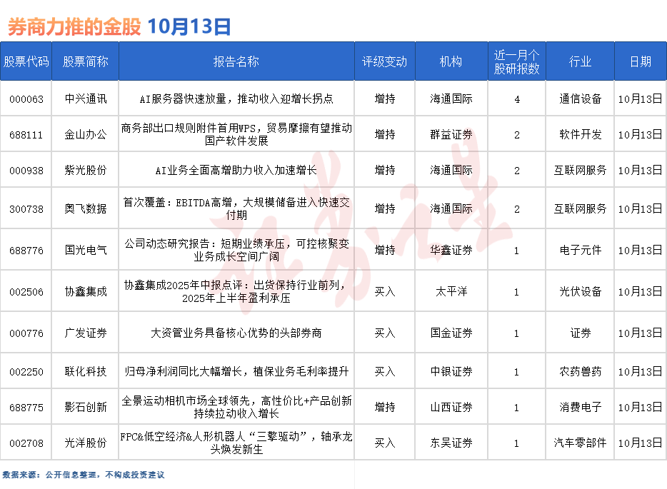 中兴通讯最受券商关注,近一个月获华鑫证券、华源证券、天风证券等4份券商研报关注,位居10月13日券商力推股榜首。