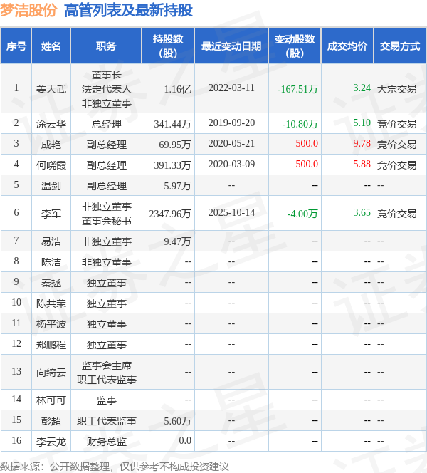 证券之星消息,根据10月15日市场公开信息、上市公司公告及交易所披露数据整理,梦洁股份(002397)最新董监高及相关人员股份变动情况:2025年10月14日公司董秘,董事李军共减持公司股份4.0万股,占公司总股本为0.0053%。变动期间公司股价上涨0.55%,10月14日当日收盘报3.63元。