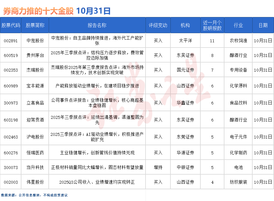 贵州茅台也备受券商关注,近一个月获国信证券、东莞证券、信达证券、群益证券、国金证券等8份券商研报关注,仅10月31日就有民生证券、万联证券、东吴证券等3份券商研报关注,位居10月31日券商力推股第二。
