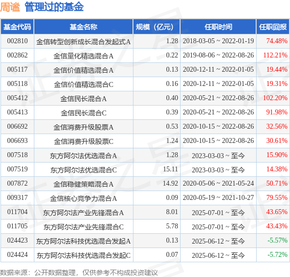 周谧先生:中国人民大学应用数学硕士。2008年9月起历任中再资产管理股份有限公司金融工程研究员、平安证券有限责任公司高级策略分析师、国金创新投资有限公司量化投资经理、深圳铸成投资有限公司投资部副总监、财富证券有限责任公司投资经理、金信基金管理有限公司投资人员。2020年5月6日至2021年5月24日担任金信稳健策略灵活配置混合型发起式证券投资基金基金经理。2020年05月19日至2021年10月27日任金信核心竞争力灵活配置混合型证券投资基金基金经理。曾任金信民长灵活配置混合型证券投资基金基金经理。2020年10月15日起至2022年8月26日任金信消费升级股票型发起式证券投资基金基金经理。2020年12月11日至2022年1月5日担任金信价值精选灵活配置混合型发起式证券投资基金基金经理。2022年01月19日离任金信转型创新成长灵活配置混合型发起式证券投资基金的基金经理。曾任金信量化精选灵活配置混合型发起式证券投资基金基金经理。2023年3月3日担任东方阿尔法优选混合型发起式证券投资基金基金经理。2025年6月12日任东方阿尔法科技优选混合型发起式证券投资基金基金经理。2025年7月1日起任东方阿尔法产业先锋混合型发起式证券投资基金基金经理。