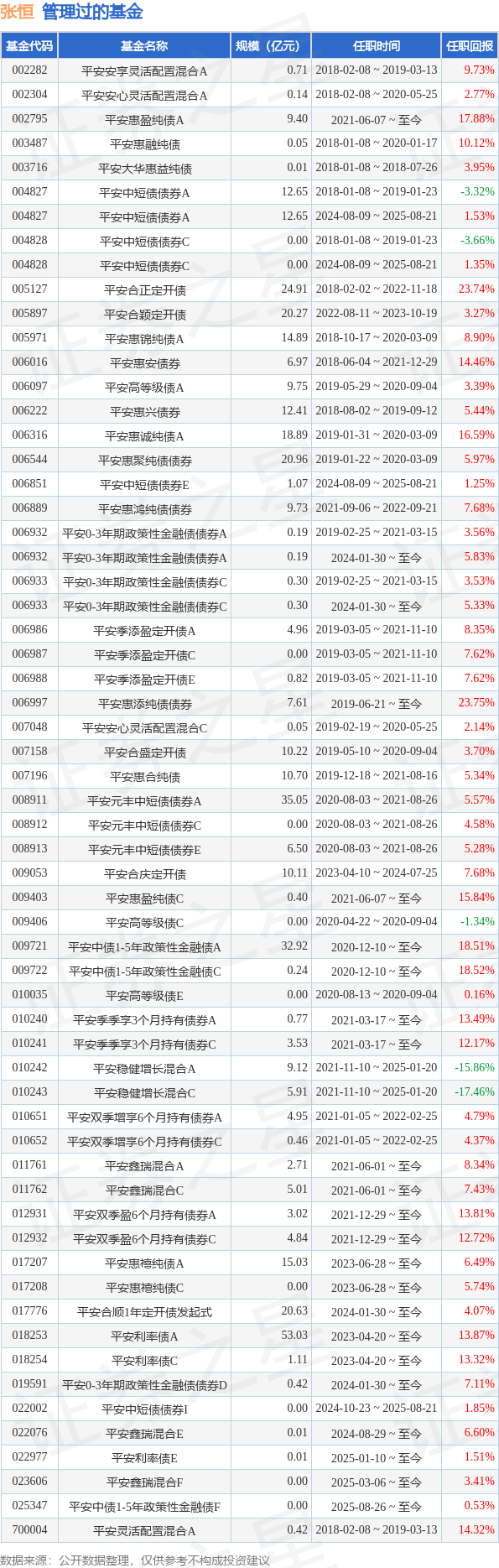 张恒先生:中国国籍,西南财经大学硕士。曾先后任职于华泰证券股份有限公司、摩根士丹利华鑫基金、景顺长城基金,2015年起在第一创业证券历任投资经理、高级投资经理、投资主办人。2017年11月加入平安基金管理有限公司,曾任固定收益投资部投资经理。现任固定收益投资中心总监助理,同时担任平安惠添纯债债券型证券投资基金(2019-06-21至今)、平安中债1-5年政策性金融债指数证券投资基金(2020-12-10至今)、平安季季享3个月持有期债券型证券投资基金(2021-03-17至今)、平安鑫瑞混合型证券投资基金(2021-06-01至今)、平安惠盈纯债债券型证券投资基金(2021-06-07至今)、平安稳健增长混合型证券投资基金(2021-11-10至2025年1月20日)、平安双季盈6个月持有期债券型证券投资基金(2021-12-29至今)、平安利率债债券型证券投资基金(2023-04-20至今)、平安惠禧纯债债券型证券投资基金(2023-06-28至今)、平安合顺1年定期开放债券型发起式证券投资基金(2024-01-30至今)、平安0-3年期政策性金融债债券型证券投资基金(2024-01-30至今)、平安中短债债券型证券投资基金(2024-08-09至2025-08-21)基金经理。曾管理的基金名称及管理时间:平安安享保本混合型证券投资基金(2018-02-08至2019-02-14)、平安鑫荣混合型证券投资基金(2018-01-08至2019-01-22)、平安大华惠益纯债债券型证券投资基金(2018-01-08至2018-07-25)、平安安享灵活配置混合型证券投资基金(2019-02-15至2019-03-13)、平安安心保本混合型证券投资基金(2018-02-08至2019-01-17)、平安大华保本混合型证券投资基金(2018-02-08至2018-10-29)、平安灵活配置混合型证券投资基金(2018-10-30至2019-03-13)、平安惠兴纯债债券型证券投资基金(2018-08-02至2019-09-12)、平安惠融纯债债券型证券投资基金(2018-01-08至2020-01-17)、平安惠锦纯债债券型证券投资基金(2018-10-17至2020-03-09)、平安惠诚纯债债券型证券投资基金(2019-01-31至2020-03-09)、平安惠聚纯债债券型证券投资基金(2019-01-22至2020-03-09)、平安安心灵活配置混合型证券投资基金(2019-01-18至2020-05-25)、平安合盛3个月定期开放债券型发起式证券投资基金(2019-05-10至2020-09-04)、平安高等级债债券型证券投资基金(2019-05-29至2020-09-04)、平安0-3年期政策性金融债债券型证券投资基金(2019-02-25至2021-03-15)、平安惠合纯债债券型证券投资基金(2019-12-18至2021-08-16)、平安元丰中短债债券型证券投资基金(2020-08-03至2021-08-26)、平安季添盈三个月定期开放债券型证券投资基金(2019-03-05至2021-11-10)、平安惠安纯债债券型证券投资基金(2018-06-04至2021-12-29)、平安双季增享6个月持有期债券型证券投资基金(2021-01-05至2022-02-25)、平安惠鸿纯债债券型证券投资基金(2021-09-06至2022-09-21)、平安合正定期开放纯债债券型发起式证券投资基金(2018-02-02至2022-11-18)、平安合颖定期开放纯债债券型发起式证券投资基金(2022-08-11至2023-10-19)、平安合庆1年定期开放债券型发起式证券投资基金(2023-04-10至2024-07-25)的基金经理。