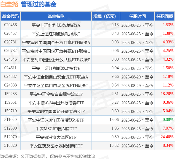 白圭尧先生:中国国籍,对外经济贸易大学硕士,曾任中国五矿集团公司交易员、中国邮政储蓄银行资产管理部投资经理、中邮理财有限责任公司组合策略部高级副总裁。2025年5月加入平安基金管理有限公司,现担任平安中证全指自由现金流交易型开放式指数证券投资基金(2025-6-25至今)、平安富时中国国企开放共赢交易型开放式指数证券投资基金(2025-6-25至今)、平安富时中国国企开放共赢交易型开放式指数证券投资基金联接基金(2025-6-25至今)、平安中证粤港澳大湾区发展主题交易型开放式指数证券投资基金(2025-6-25至今)、平安上证红利低波动指数型证券投资基金(2025-6-25至今)、平安MSCI中国A股低波动交易型开放式指数证券投资基金(2025-6-25至今)、平安中证医药及医疗器械创新交易型开放式指数证券投资基金(2025-6-25至今)、平安中债-0-3年国开行债券交易型开放式指数证券投资基金(2025-6-25至今)、平安中证5-10年期国债活跃券交易型开放式指数证券投资基金(2025-6-25至今)、平安中证全指自由现金流交易型开放式指数证券投资基金联接基金(2025年8月29日起至今)基金经理。