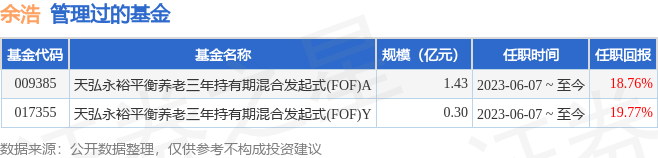 余浩先生:2012年7月至2015年8月东兴证券股份有限公司量化股票研究员;2015年11月至2021年6月中荷人寿保险有限公司权益研究员、投资经理;2021年6月至2022年12月中意资产管理有限责任公司权益投资经理;2022年12月加盟天弘基金管理有限公司,现任天弘永裕平衡养老目标三年持有期混合型发起式基金中基金(FOF)基金经理。