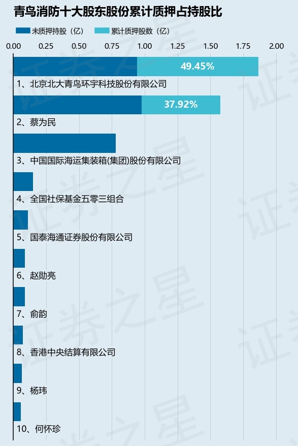 截止本公告日,股东北京北大青鸟环宇科技股份有限公司已累计质押股份9225.55万股,占其持股总数的49.45%,股东蔡为民已累计质押股份5968.63万股,占其持股总数的37.92%。本次质押后青鸟消防十大股东的累计质押股份占持股比例(占持股比例的计算以公司最新一期财务报表公布的十大股东的持股总数为基准)见下图: