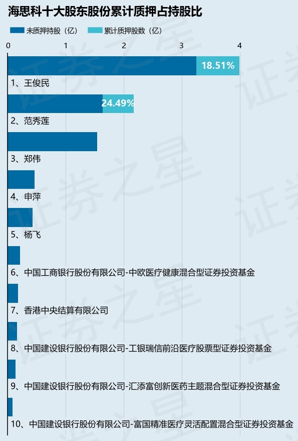 截止本公告日,股东王俊民已累计质押股份7397.0万股,占其持股总数的18.51%,股东范秀莲已累计质押股份5323.0万股,占其持股总数的24.49%。本次质押后海思科十大股东的累计质押股份占持股比例(占持股比例的计算以公司最新一期财务报表公布的十大股东的持股总数为基准)见下图: